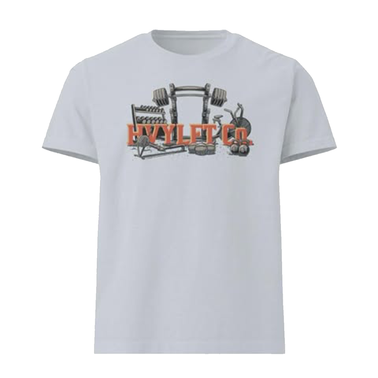 Built for big sessions and off-day chill. Front graphic features HVYLFT Co. surrounded by the tools of the grind—bars, bells, bike, and bags—hand-illustrated with that chalk-dust vibe. Boxy, drop-shoulder fit with roomy sleeves so you can move easy. Crafted for Motion.